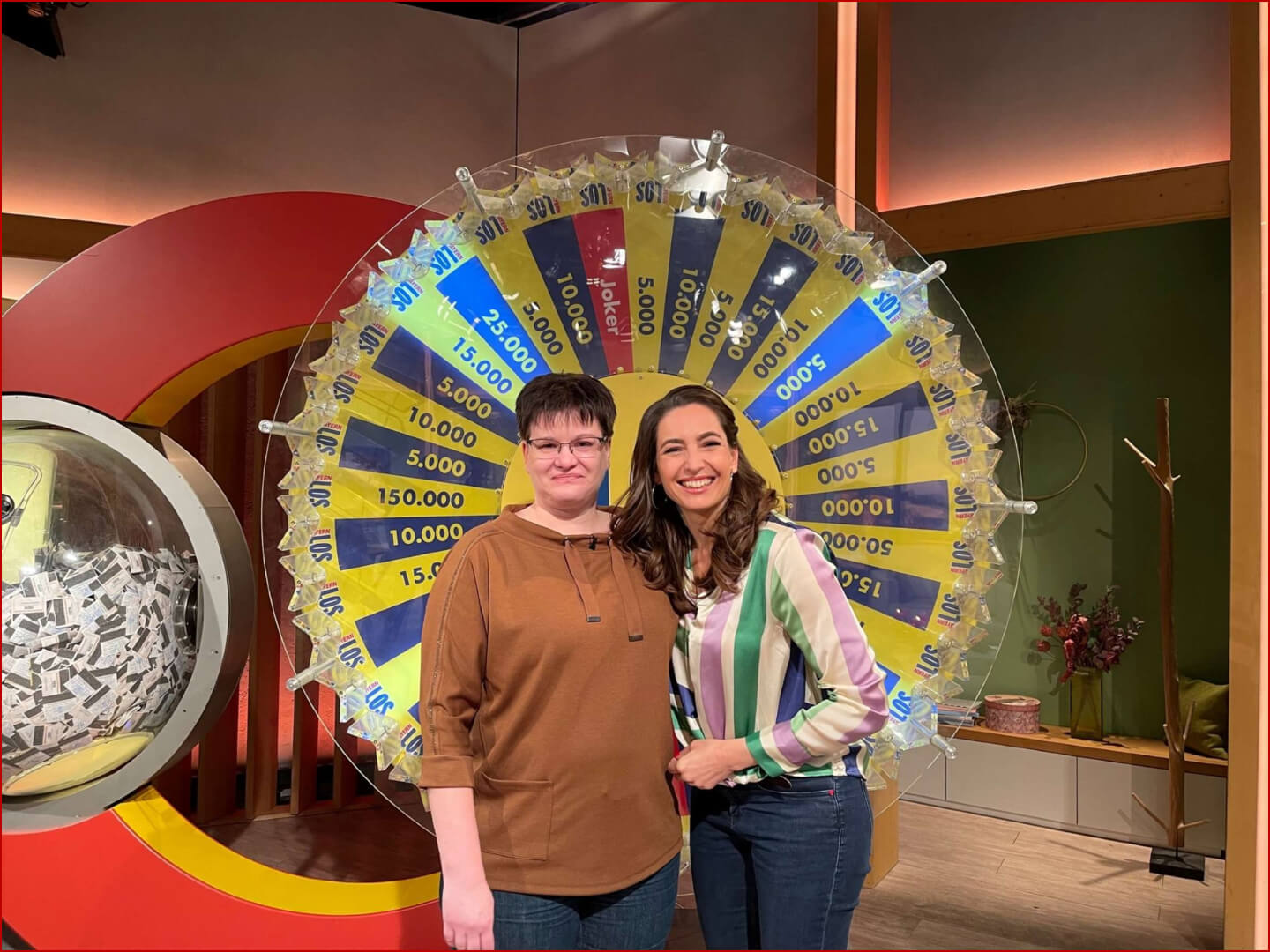 Du erhältst zunächst einen garantierten Gewinn von mindestens 5.000 Euro. Dazu wirst du ins BR-Studio eingeladen, wo du live am Gewinnrad drehen und deinen Gewinn auf bis zu 150.000 Euro steigern kannst – oder sogar bis zu 450.000 Euro, wenn der Joker fällt.